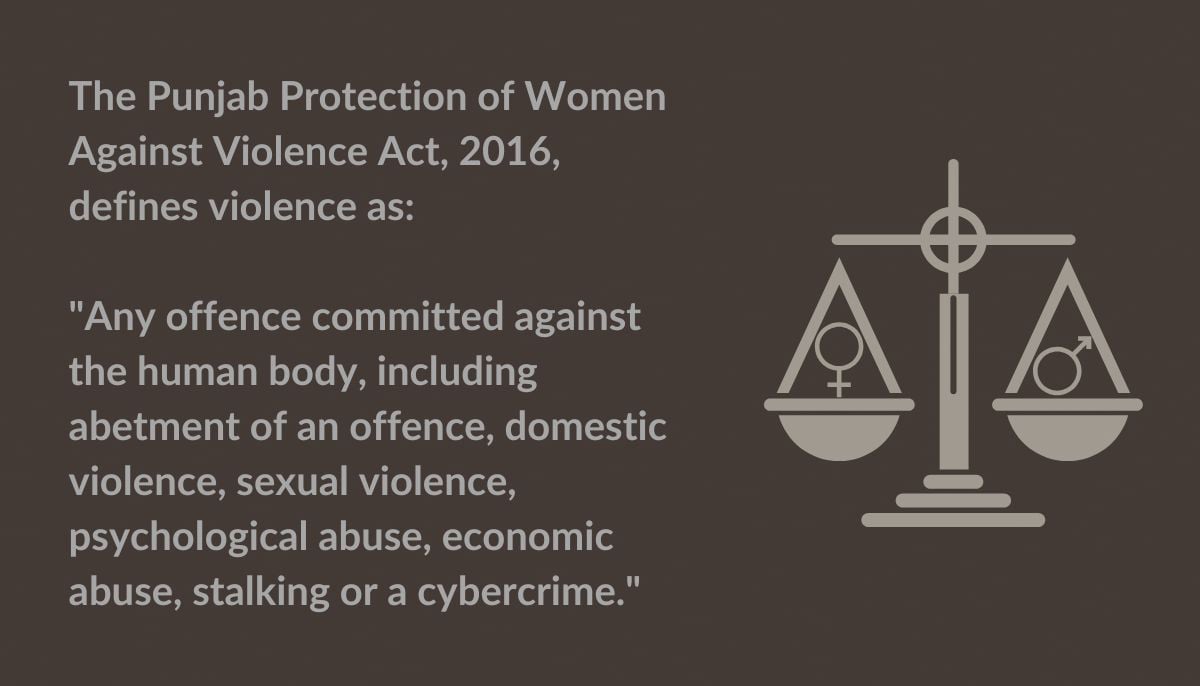 Pakistan’s commitment to international conventions like CEDAW has led to the development of several laws and policies, one such attempt, the Punjab Protection of Women Against Violence Act, 2016, defines violence as: "Any offence committed against the human body, including abetment of an offence, domestic violence, sexual violence, psychological abuse, economic abuse, stalking or a cybercrime."