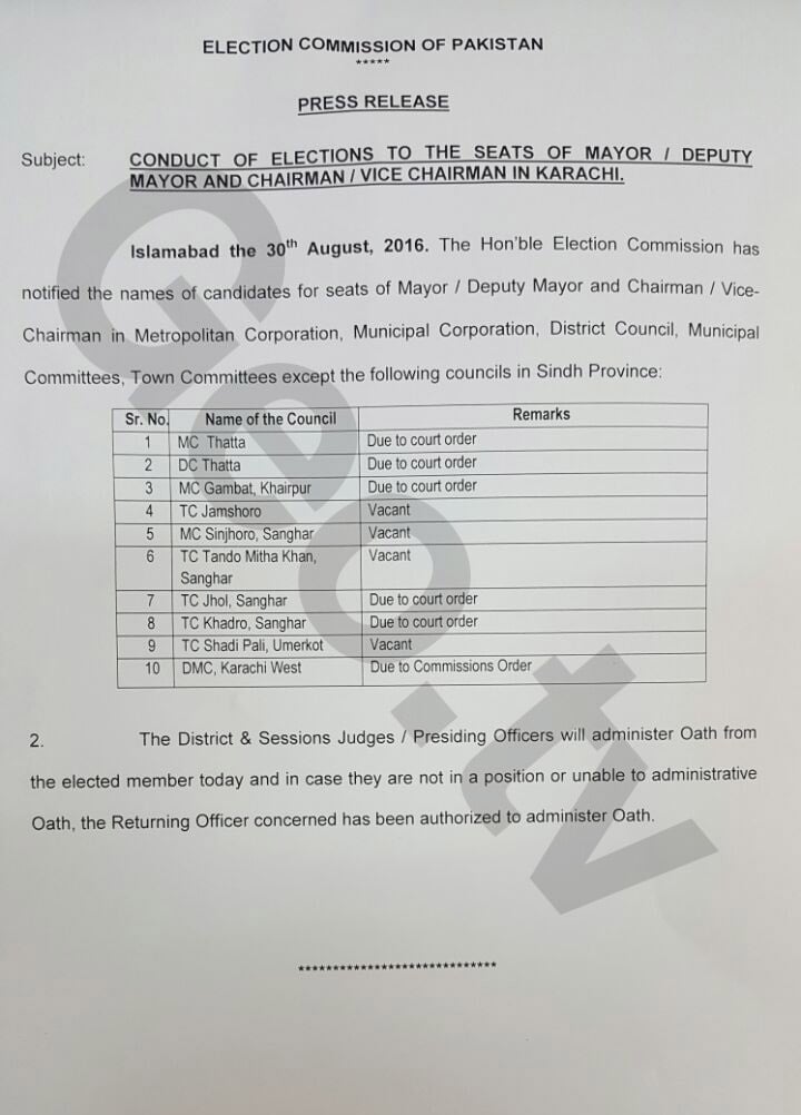 The ECP notified the winning candidates for Mayor, Deputy Mayor, along with the Chairmen and Vice Chairmen across the province. However the notification District West in Karachi and nine other districts have been withheld.