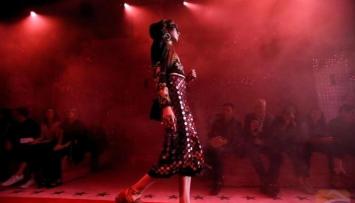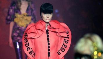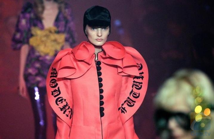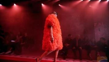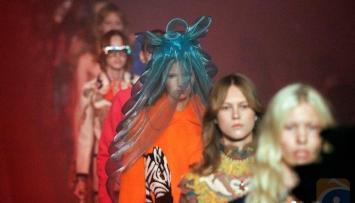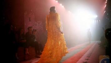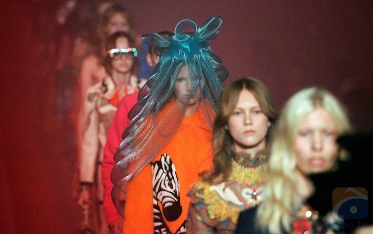 In Gucci's magic lanterns collection, layered and ruffled gowns, gold decorations and outfits echoing a hippy style took center stage. Dragons, jelly fish and parrots decorated coats and dresses and two zebras stood on a big orange fur coat.