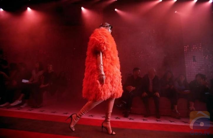 To the beat of melancholic violins, models strutted down a starred and striped pink carpet in a former rail station dressed up in metallic pink panelling.
