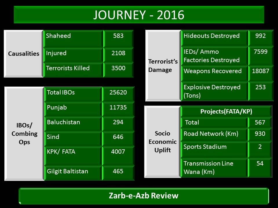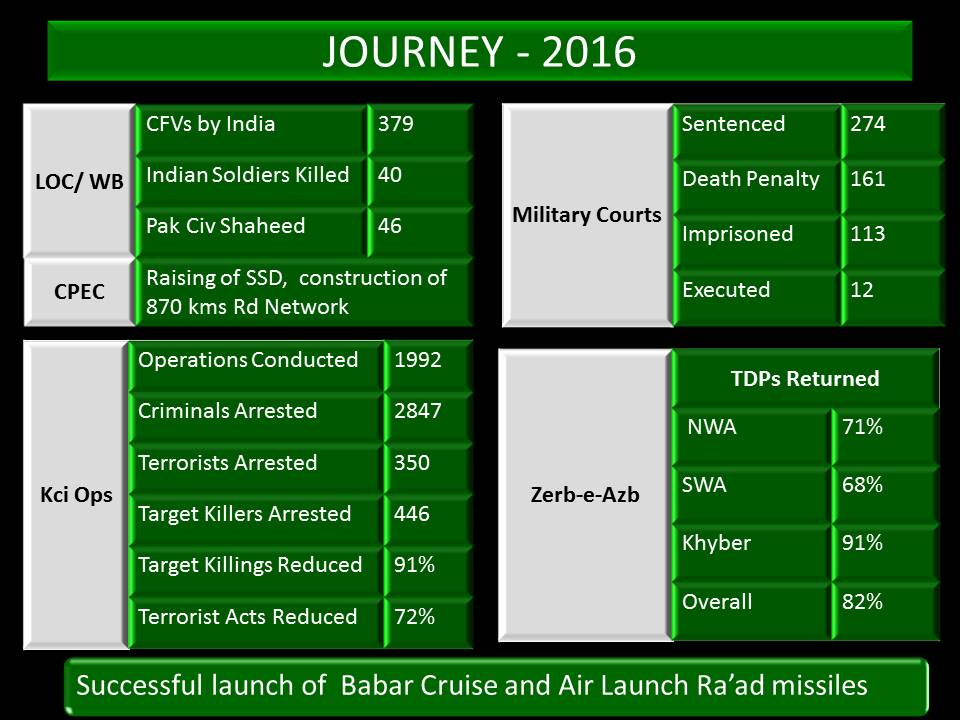 RAWALPINDI: The Inter Services Public Relations (ISPR) Saturday issued review of year 2016 outlining defense and security achievements in the outgoing year towards a 'secure and peaceful Pakistan'.