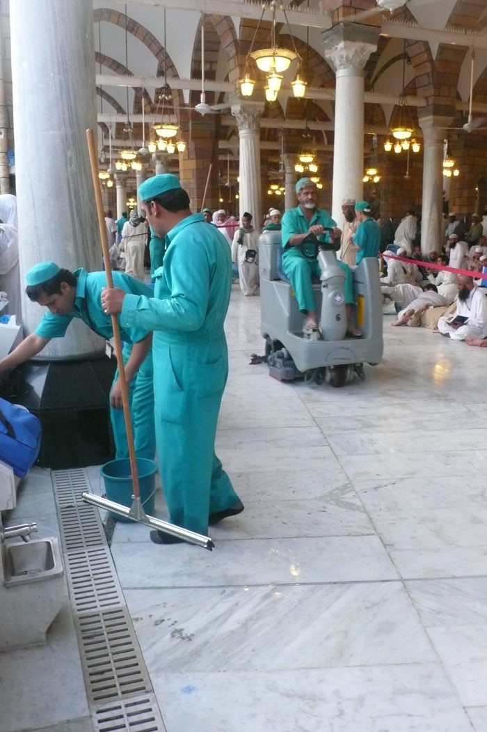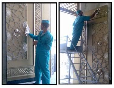 Work is divided on four shifts with different teams tasked to clean pillars, walls, roofs and domes, escalators, stairs, copper plates, water and rain drainages, outer walls, corridors’ floors and perfume them with oil, windows and areas where pigeons gather.