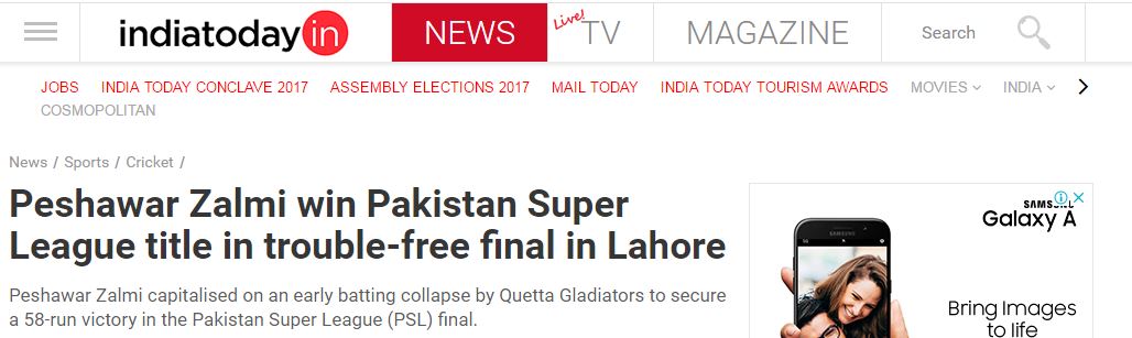India Today went with: ‘Peshawar Zalmi win Pakistan Super League title in trouble-free final in Lahore’.