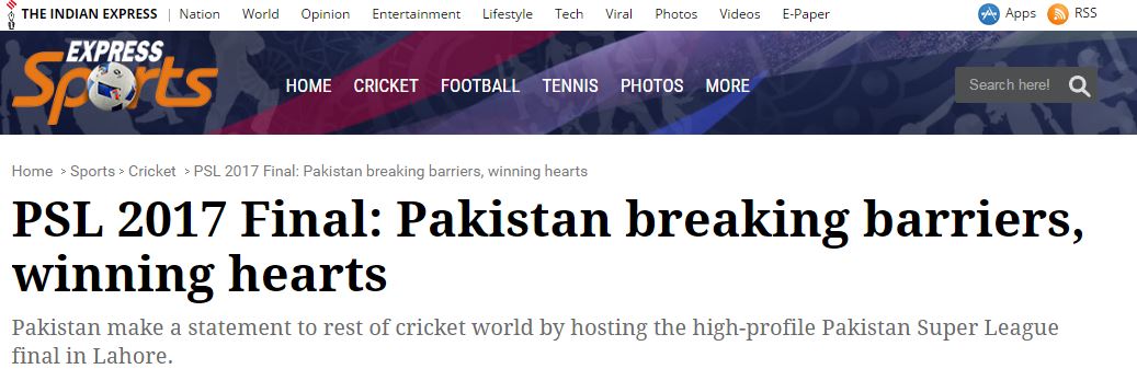 Leading Indian publication The Indian Express reported the historic night with the headline ‘PSL 2017 Final: Pakistan breaking barriers, winning hearts’.
