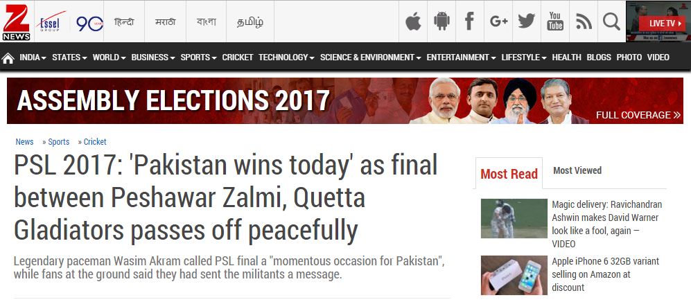 Zee News led the coverage with ‘Pakistan wins today as final between Peshawar Zalmi, Quetta Gladiators passes off peacefully’.