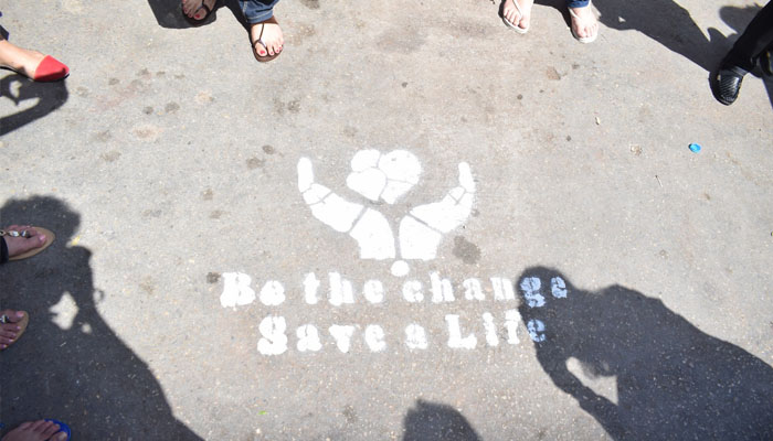 "Be the change. Save a life," reads the phrase spray-painted on the ground by a demonstrator, March 18, 2017. GEO/Haseem uz Zaman
