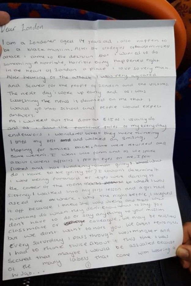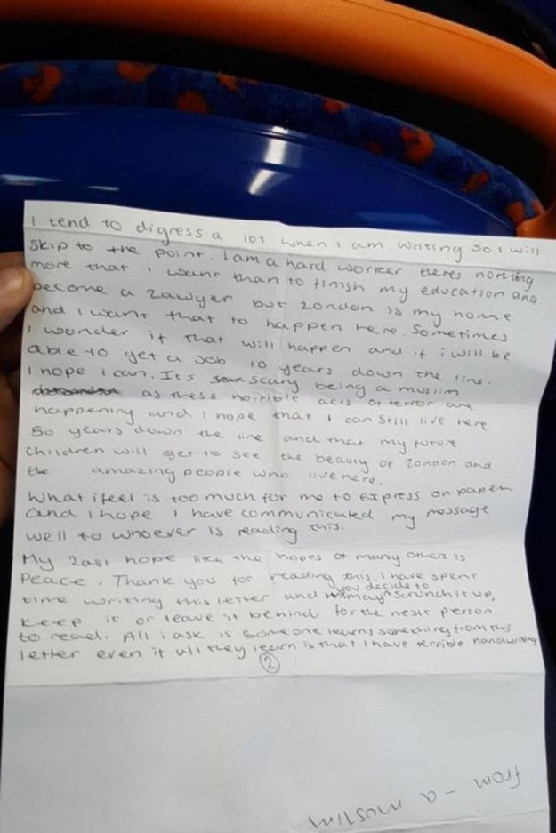 It's scary being a Muslim as these horrible acts of terror are happening and I hope that I can still live here 50 years down the line and that my future children will get so see the beauty of London and the amazing who live here,” wrote a Muslim teenager in a letter left on a London bus.