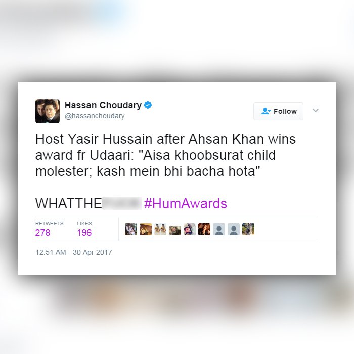 Last night #HumAwards when Ahsan Khan won for #Udaari, host Yasir Hussain joked "Itna khobsurat child molester, kash main bhi bacha hota"