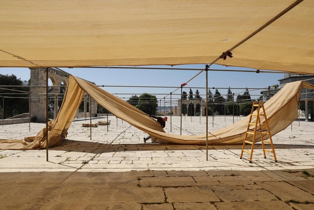 An employee of the Jordanian Waqf, or Islamic trust, that oversees the area, constructs a shade during preparations for the Muslim holy month of Ramadan on the compound known to Muslims as al-Haram al-Sharif and to Jews as Temple Mount, in Jerusalem´s Old City, May 6, 2017. REUTERS/Ammar Awad