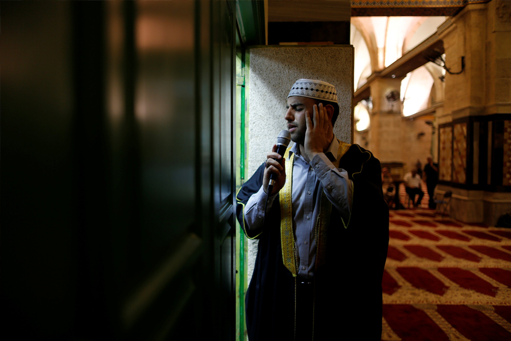 Firas Kazaz, a Palestinian muezzin, dressed in traditional clothing, calls Muslims to prayer, inside al-Aqsa Mosque, on the compound known to Muslims as al-Haram al-Sharif and to Jews as Temple Mount, in Jerusalem´s Old City, May 17, 2017. REUTERS/Ammar Awad