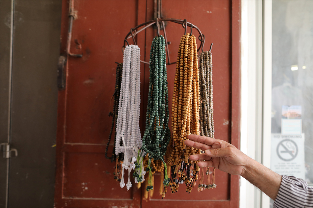 A Palestinian vendor touches Muslim prayer beads displayed on sale at his shop in a market in Jerusalem´s Old City, May 10, 2017. REUTERS/Ammar Awad