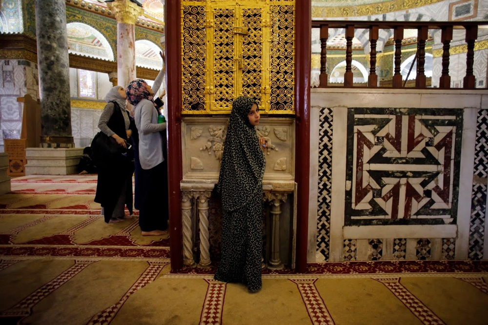 A Palestinian girl places her hand on a marble slab covered with perfume inside the Dome of the Rock located on the compound known to Muslims as al-Haram al-Sharif and to Jews as Temple Mount, in Jerusalem´s Old City, May 4, 2017. REUTERS/Ammar Awad