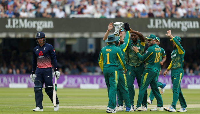 The fifth ball of the match saw Rabada strike when Jason Roy edged a good length ball to Hashim Amla at first slip.