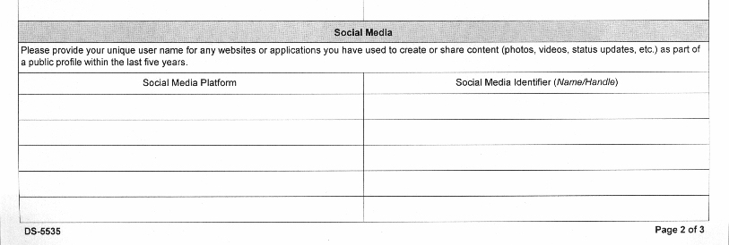 While the new questions are voluntary, the form says failure to provide the information may delay or prevent the processing of an individual visa application.