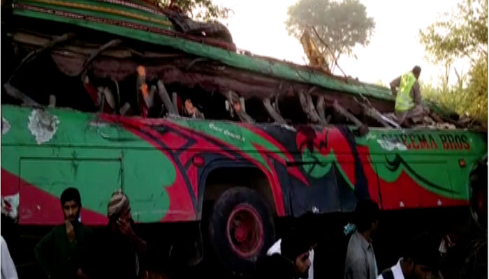 Rescue sources said the bus, carrying around 50 passengers from Faisalabad to Multan, was speeding at a crossing when it collided with a truck.