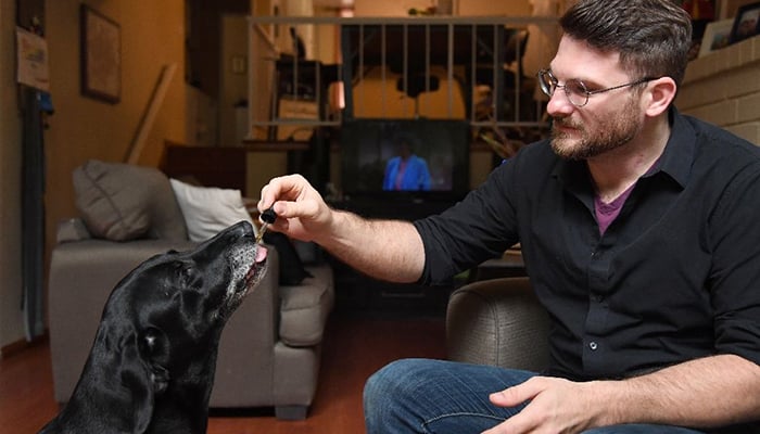 The black labrador, tail wagging, laps up the liquid tincture owner Brett Hartmann squirts into her mouth, a remedy he uses morning and evening to help alleviate Cayley's anxiety.