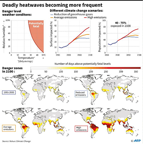 A study released Monday warned that deadly heatwaves will become more and more common around the world even if the rise in temperatures is capped at 2.0 degrees C as targeted by the Paris Agreement to combat climate change.