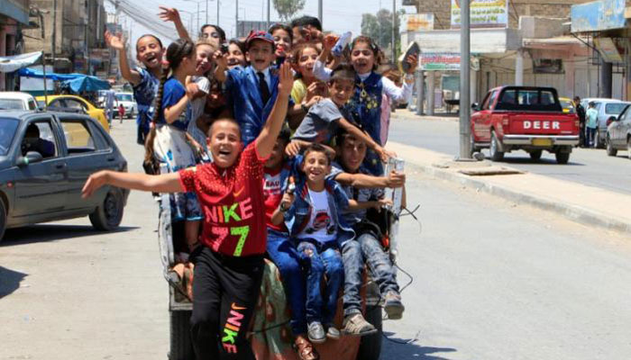 Children gathered in squares on the eastern side of the city. Some played on old swings and others with toy guns and rifles, which were among the toys allowed by Daesh militants after they took over the city in June 2014.