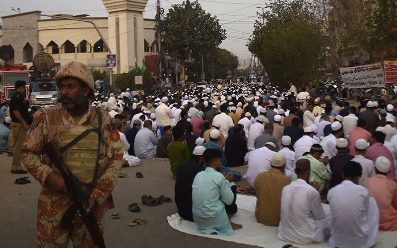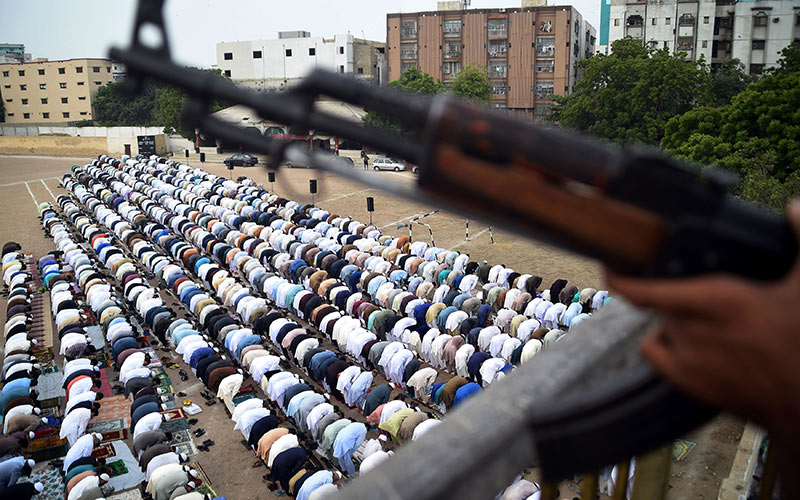 A policeman stands guard as Muslims offer Eid al-Fitr prayers at an Eidgah ground in Karachi on June 26, 2017. —AFP photo