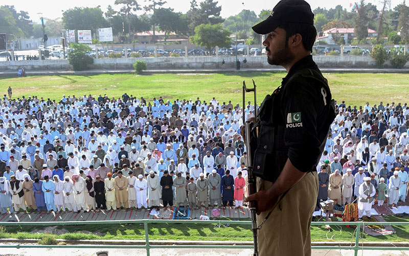 A policeman stands guard as Muslims offer Eid ul-Fitr prayers in Quetta on June 26, 2017.—AFP photo