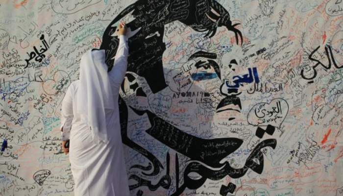 A Qatari artist whose portrait of Qatar's emir has been draped from skyscrapers and affixed to car windows across the capital signed T-shirts for Qataris at a museum on Saturday.