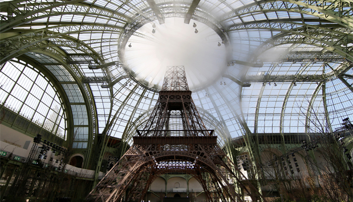 Lagerfeld's Chanel show under the dome of the Grand Palais – dominated by his Eiffel Tower – was a celebration of Paris, with a small army of more than 60 of the world's top models on the runway.