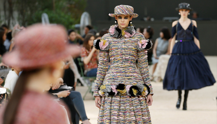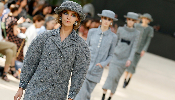 The designer went strong on Chanel's classic tweed look with subtly inset crystals for his winter coats and suits. Shoulders were much more rounded, and all the models – bar the final bride – wore brimmed hats somewhere between a boater and a bowler.