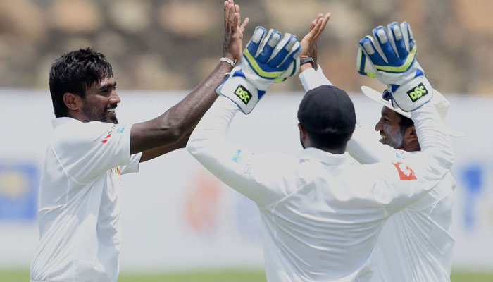 Former captain Angelo Mathews was batting on 54 with Dilruwan Perera on six when stumps were drawn for the day, with Sri Lanka still trailing by 446 runs with five wickets in hand.