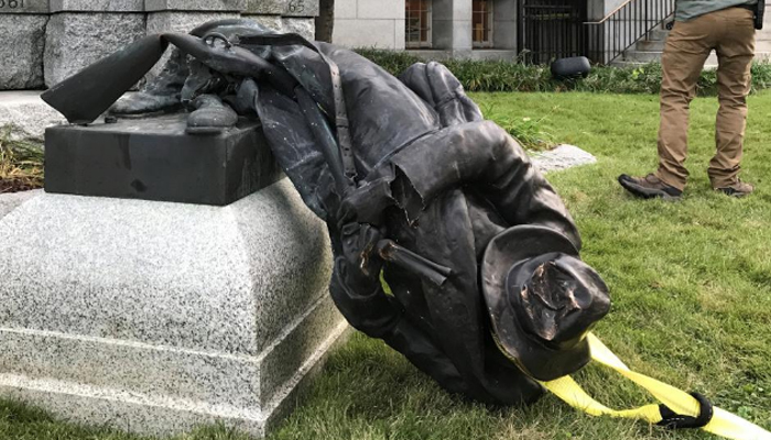 Some opponents took matters into their own hands. Demonstrators stormed the site of a Confederate monument outside a courthouse in Durham, North Carolina, on Monday and toppled the bronze statue from its base.
