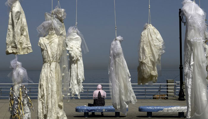 COVER IMAGE: This file photo – taken on April 22, 2017 – shows a veiled woman sitting on a bench near an installation of wedding dresses by Lebanese artist Mireille Honein and Abaad NGO at Beirut's Corniche, denouncing the article 522 of Lebanon's penal code allowing rapists who marry their victims to go free. AFP/Patrick Baz