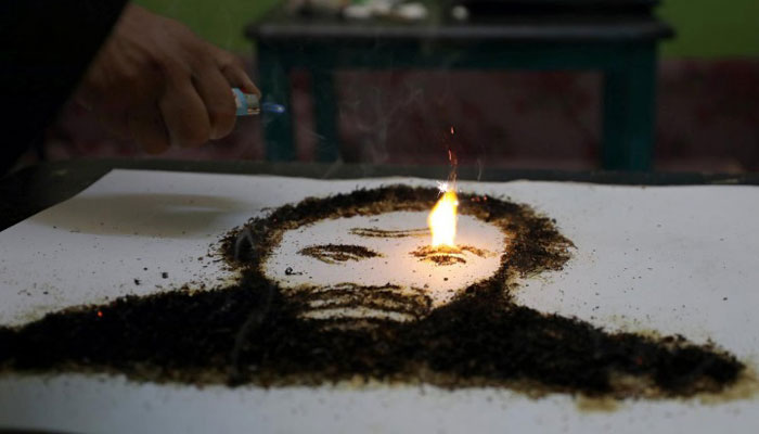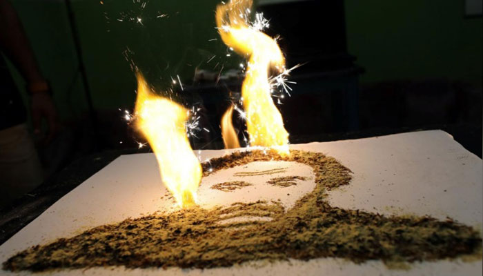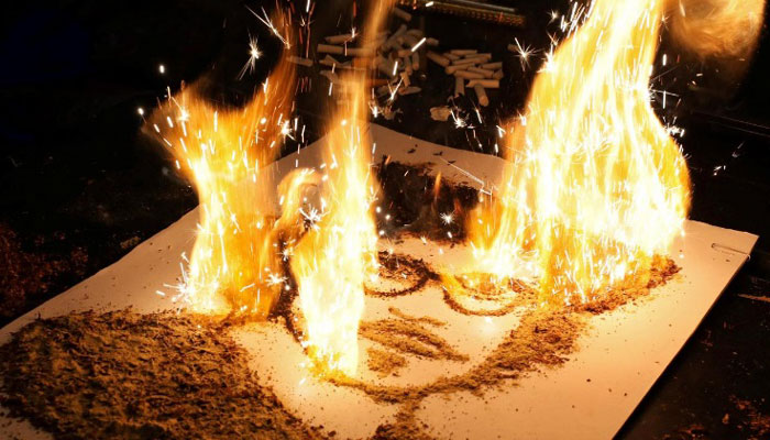 The cigarettes fuel his art; he breaks them in half, painstakingly traces out monochrome images of celebrities or animals with the fine flakes of tobacco, then sprinkles his creations with gunpowder and sets them on fire.