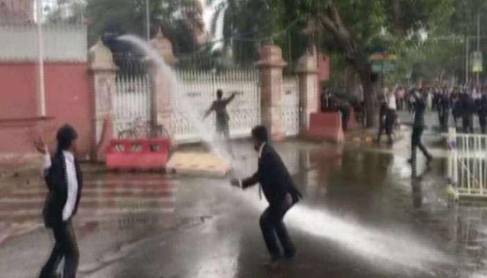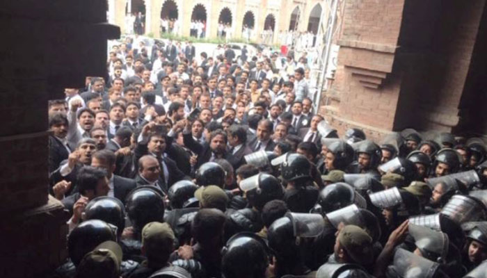 Authorities used tear gas and water cannon to disperse the protesting lawyers while members of the legal fraternity pelted stones at the LHC building and police personnel protecting it.