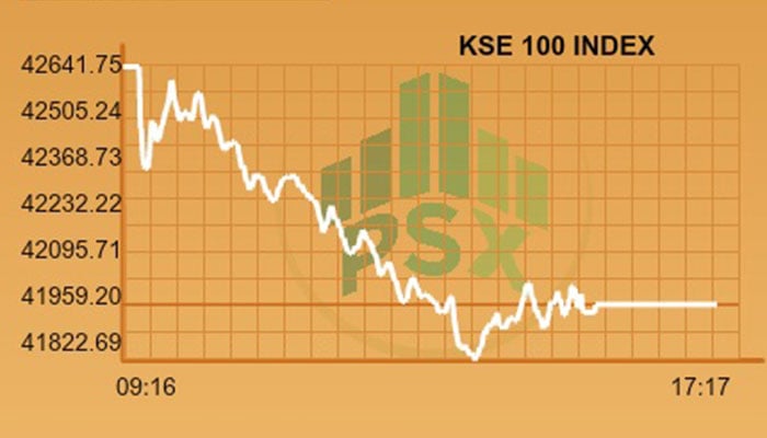 KARACHI: The bearish trend at Pakistan Stock Exchange continued as the KSE-100 index closed below the psychological barrier of 42,000 points on Monday after witnessing a negative change of 1.57 per cent.