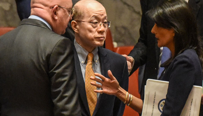 US Ambassador to the UN Nikki Haley (right) speaks with her Chinese counterpart Liu Jieyi before a UN Security Council meeting over North Korea, on September 4. — AFP