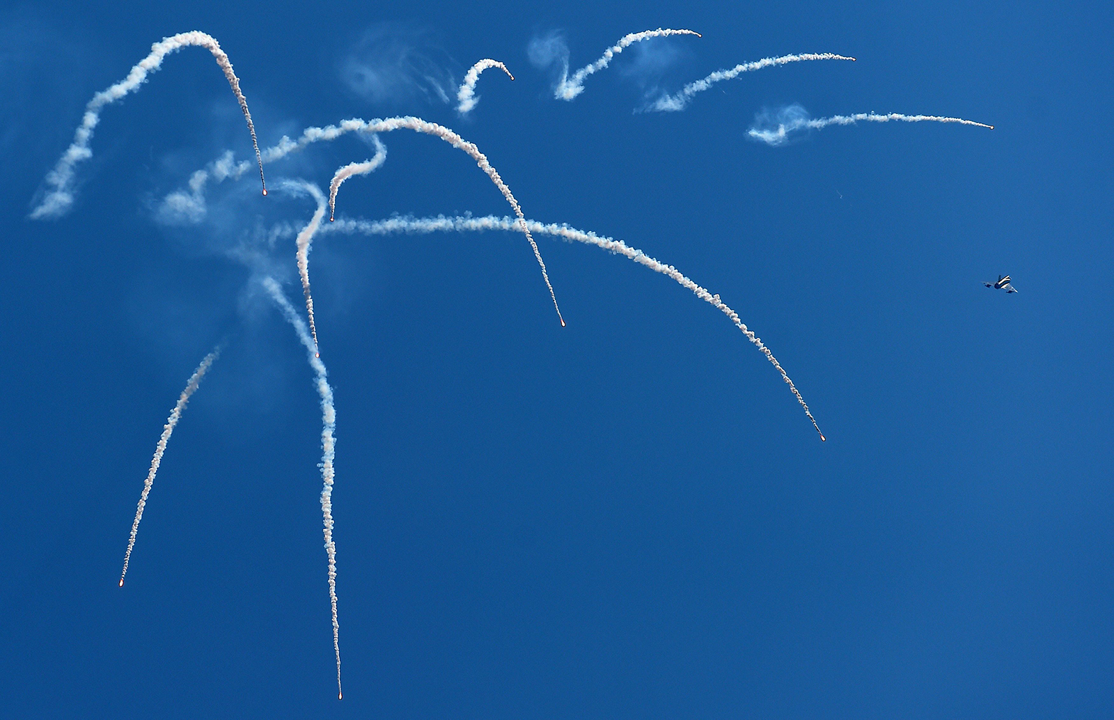 A Pakistan jet fighter (R) drops flares during celebrations to mark Defence Day at the Nur Khan military airbase in Islamabad on September 6, 2017 - AFP
