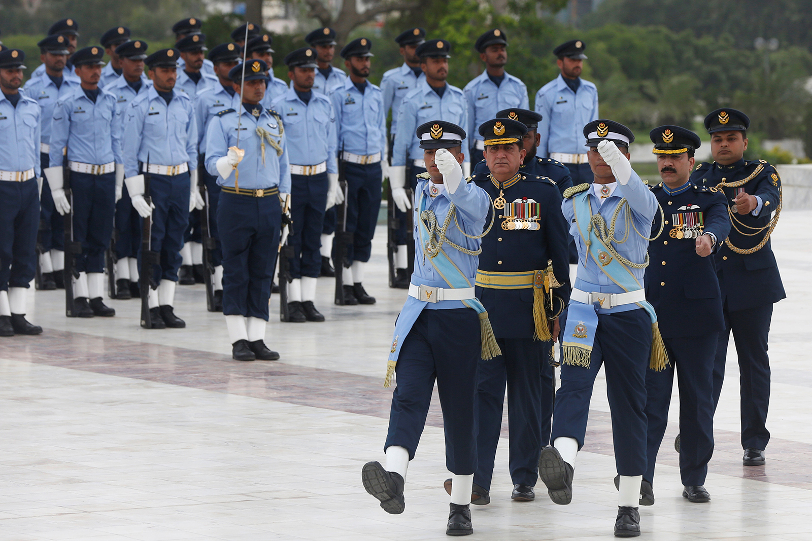 Air Vice Marshal Imran Khalid (front row 2nd L), Air Officer Commanding, Pakistan Air Force (PAF) academy Risalpur, walks with officers at the mausoleum of Muhammad Ali Jinnah during Defence Day ceremonies - Reuters