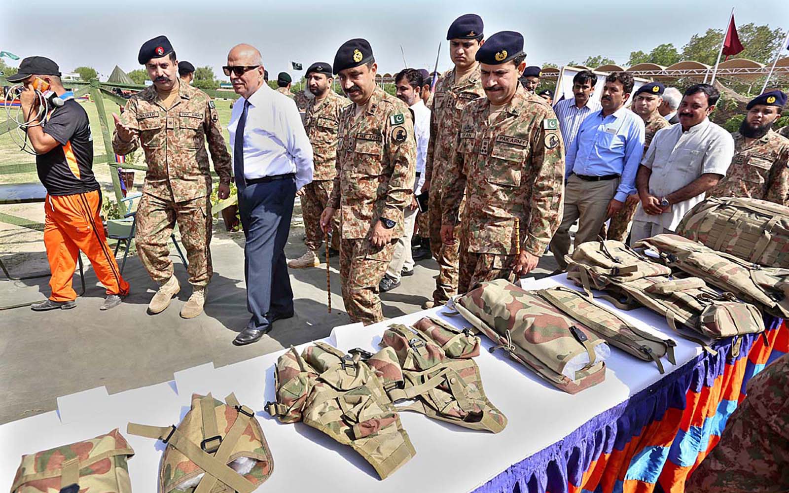 GOC Major General Muhammad Ali visiting different stalls and watching arms and equipment displayed at Garrison Sports Stadium in connection with Defence Day of Pakistan - APP