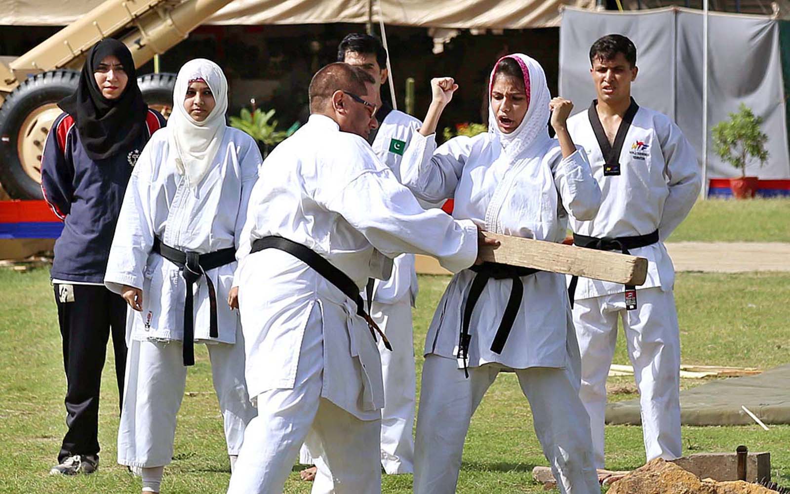 Karate team performing their skills during exhibition of arms and equipments at Garrison Sports Stadium in connection with Defence Day of Pakistan - APP