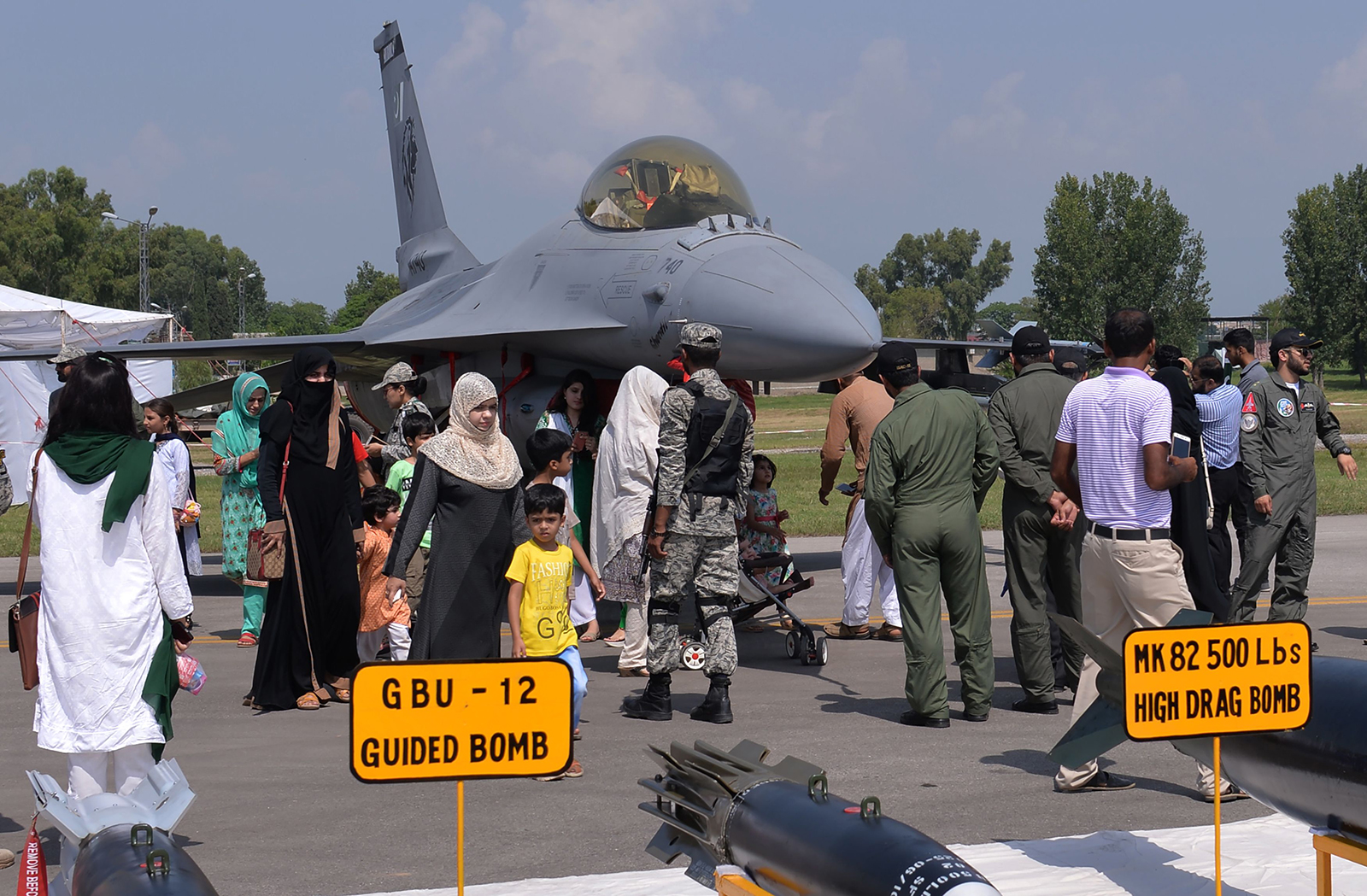 Pakistanis look at a F-16 jet fighter during celebrations to mark Defence Day at the Nur Khan military airbase in Islamabad on September 6, 2017.- AFP