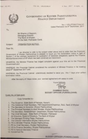 PESHAWAR: The Khyber Pakhtunkhwa Finance Department issued on Thursday a notice to the Bank of Khyber (BoK) managing director Shams-ul-Qayyum informing him of his termination for misconduct.