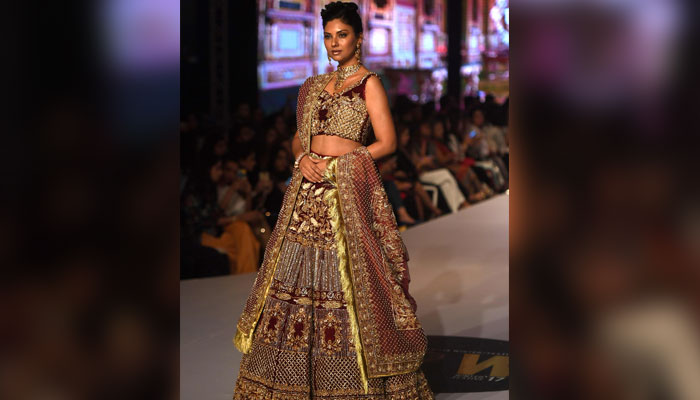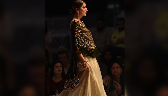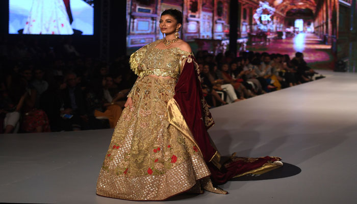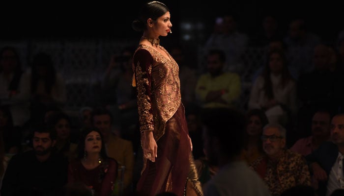 Model showcases designer Aamna Aqeel's dress as she walks the ramp. Photo: AFP