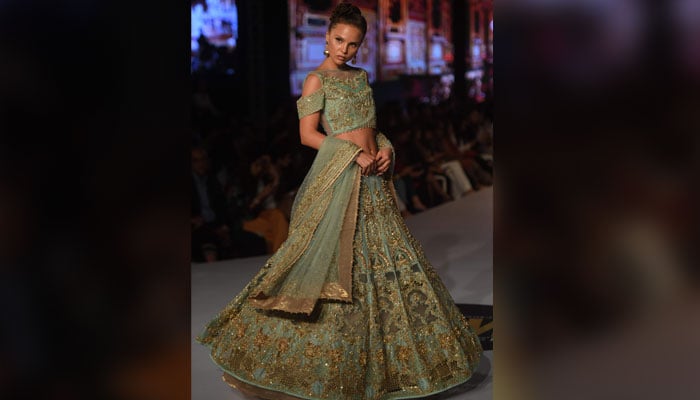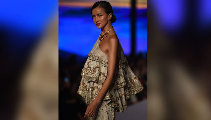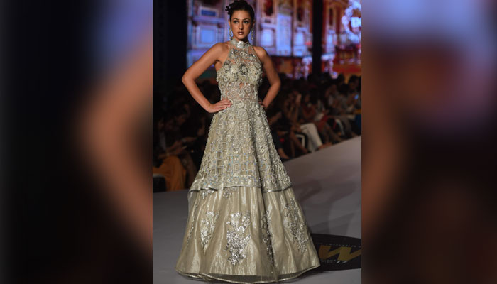 Designer Erum Khan's dress being showcased on the ramp. Photo: AFP