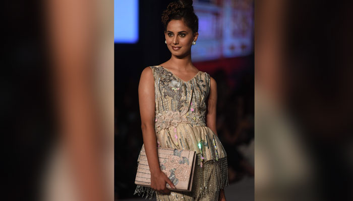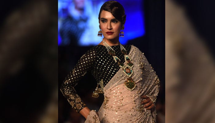 Model Nadia Hussain wears a dress by designer Aamna Aqeel. Photo: AFP
