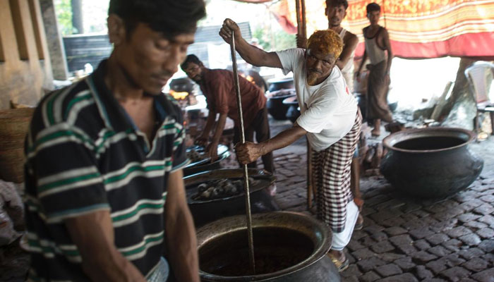 In a nearby canteen, men in singlets sweated over huge cauldrons, toiling throughout the night to make rice, meat and lentils.