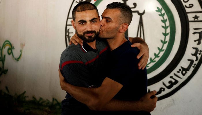 A member of Fatah movement is hugged and kissed upon his release from a Hamas-run jail as part of reconciliation efforts, in Gaza City. Photo: Reuters