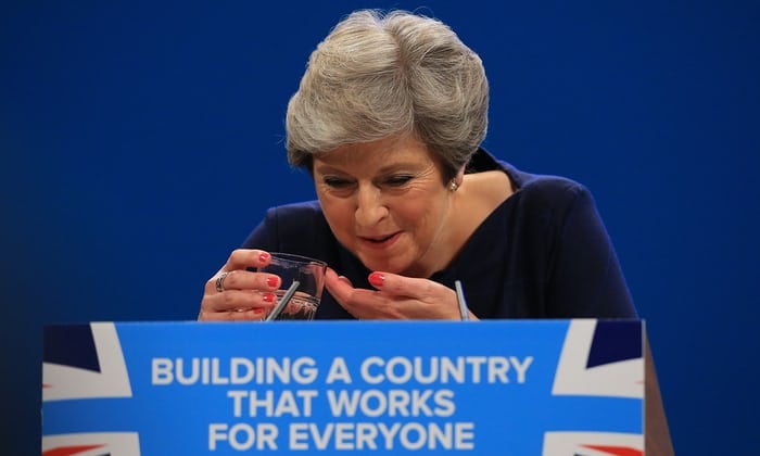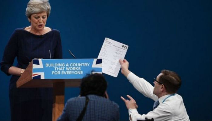 In one of the most bizarre British political speeches in a generation, May speech to her annual conference was ruined by a comedian handing her a bogus employment termination letter “signed” rival Johnson, by repeated coughing fits and even by letters falling off the slogans on the set behind her.
