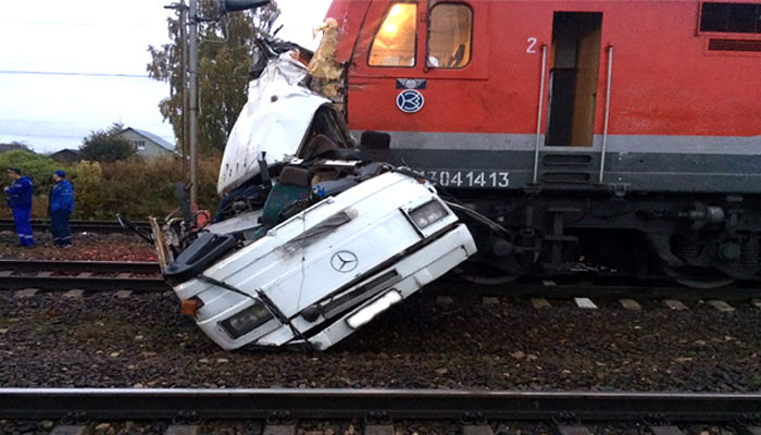 The regional interior ministry said the bus broke down on the level crossing.