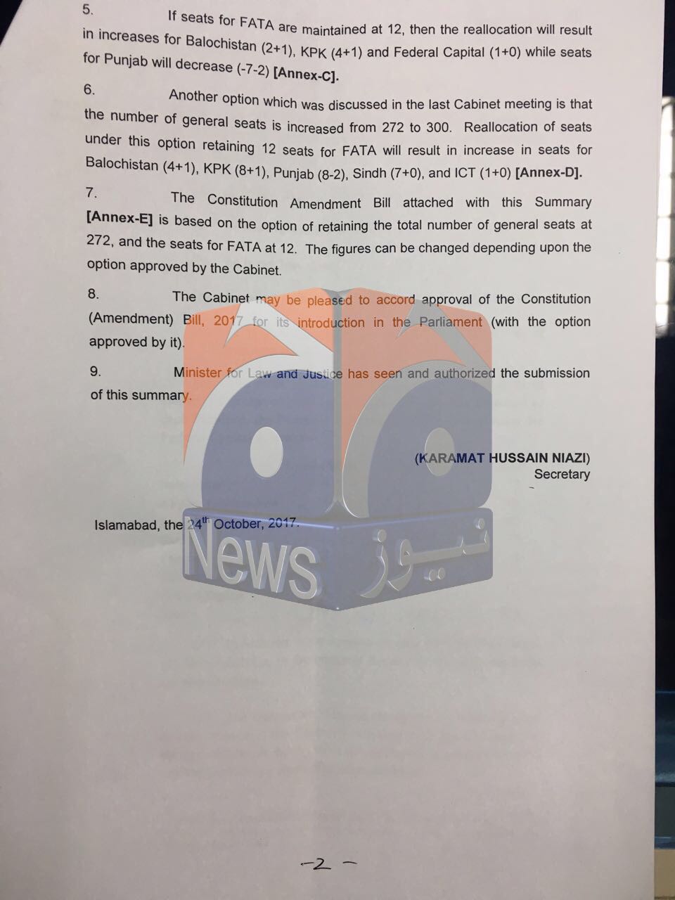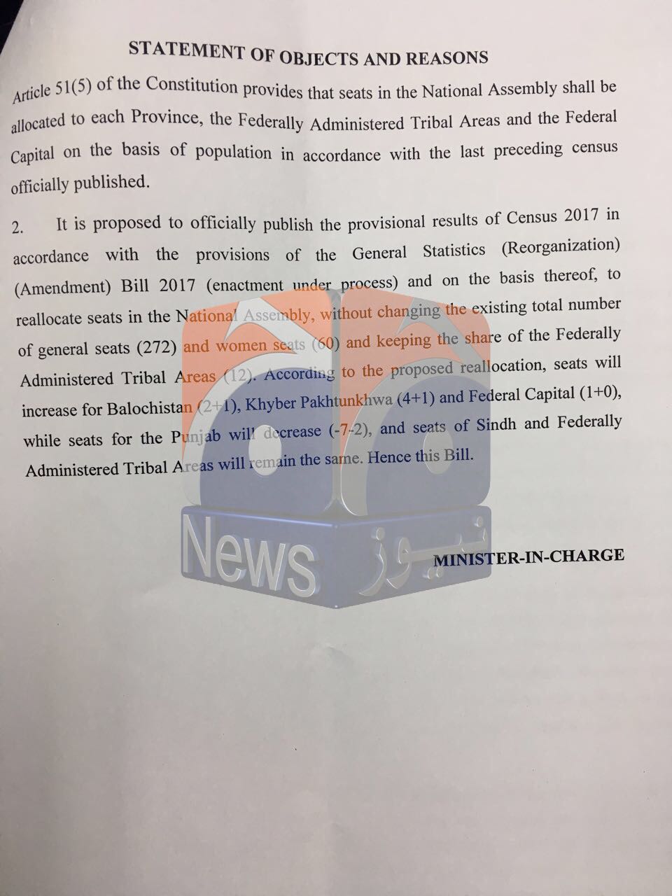 Geo News has obtained copies of the summary of the formulas, which will be presented before the cabinet for reallocation in the number of general seats in the National Assembly on the basis of the provisional results of the population census conducted earlier this year.