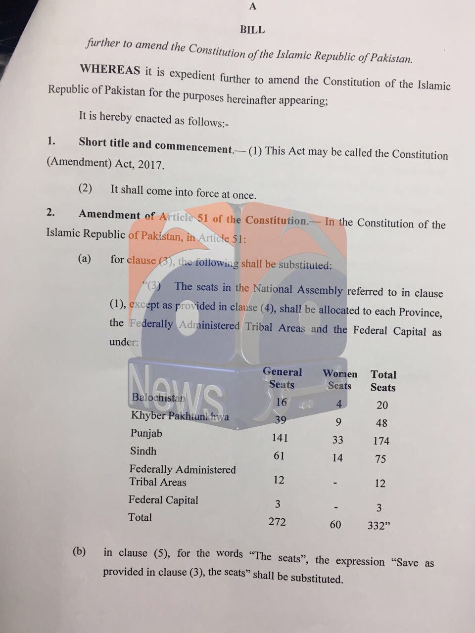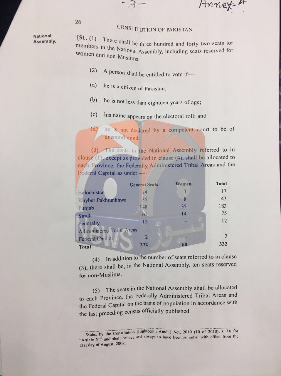 “If seats in the National Assembly are reallocated on the basis of officially published provisional results of census 2017 without changing the existing total number of general seats (272) and women seats (60), seats will increase for Balochistan (2 general seats and one woman seat), Khyber Pakhtunkhwa (5+1), Sindh (2+0) and the Federal Capital (1+0) while seats will decrease for Punjab (-4-2) and FATA (-6),” the first formula states.