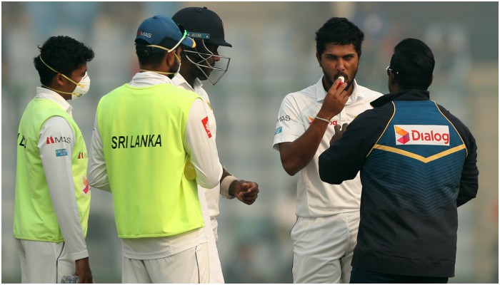 Sri Lankan fielders wore masks and their coach Nic Pothas said some vomited in the dressing room Sunday. But Indian players were not masked when it was their turn to field on Monday.